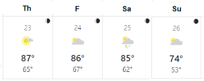 It will be warm Thursday through Saturday, but quite comfortable on Sunday. We'll have plenty of water to drink. The nights will be comfy, though. Restaurants may have their A/C kicked up high, so plan to bring along a sweater or a light jacket.